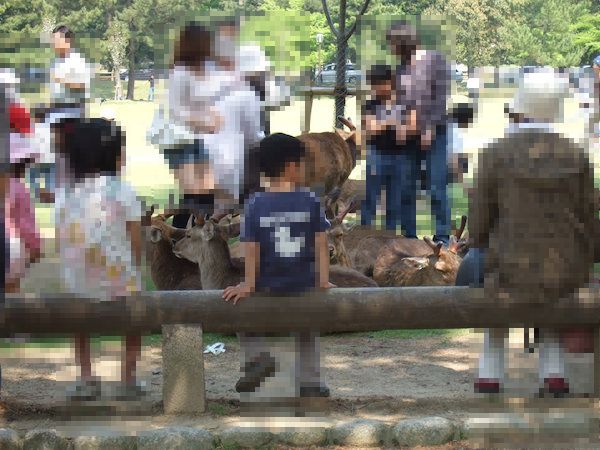 煎餅をあげて鹿に遊んでもらう人たちを眺めつつ